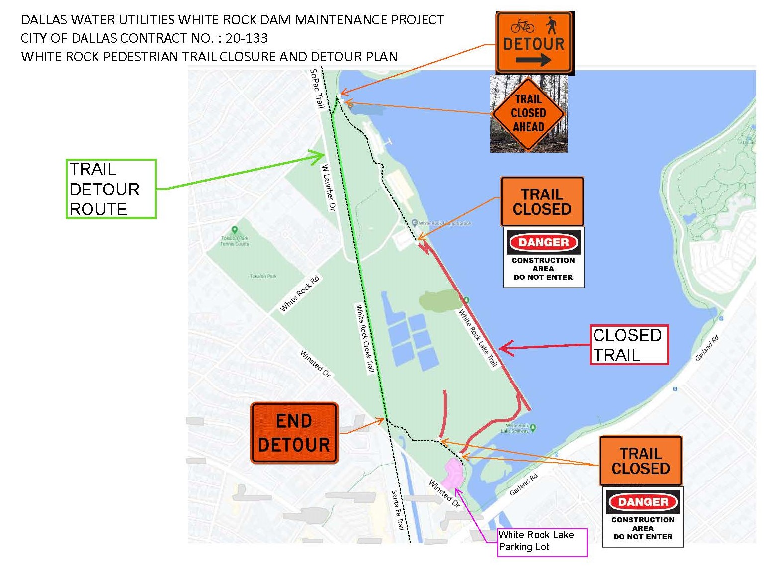 During construction activities beginning in early December 2020, signs will be posted indicating portions of trails that will be closed and rerouted to open trails. Trail users going south on the White Rock Lake Trail can merge over and continue South on the Santa Fe Trail. Patrons going south on the So Pac Trail can continue south on the Santa Fe Trail. Patrons accessing the Winsted Parking Lot, or North from the White Rock Lake Trail, can