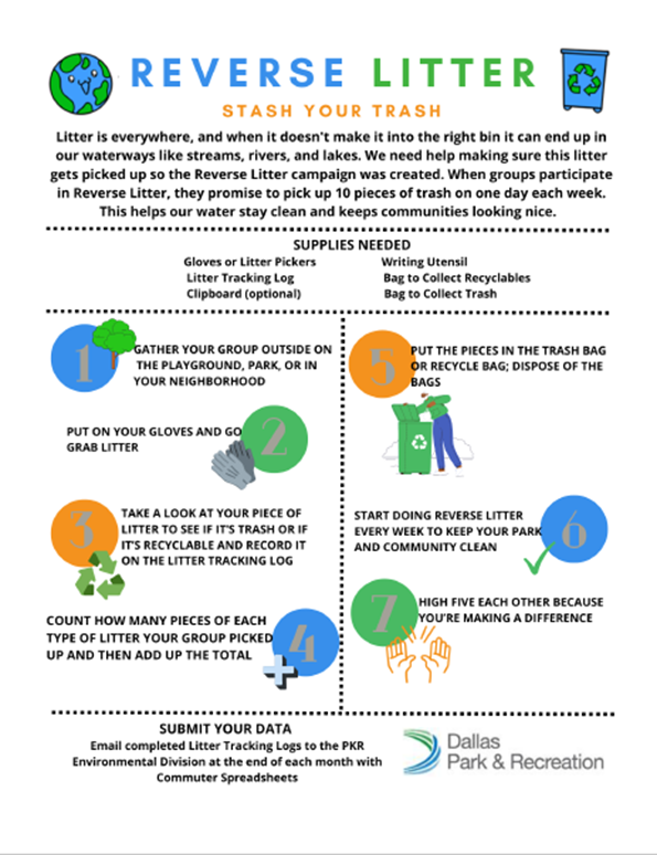 Youth at Dallas’ recreation centers are participating in the City’s Reverse Litter program. Once a week, they explore their community parks searching for litter, recording the types of litter they find, and remove it. This program educates them about the impact of litter in our communities, how it can pollute water bodies, and the differences between recyclable materials and trash. Youth participate in citizen science by completing a litter tracking log which provides data. Reverse Litter empowers youth to take action to keep our water clean and parks looking nice. Since the program began in February 2023, more than 300 youth in the Out-of-School Time and Summer programs have logged over 100,00 pieces of litter, making a positive impact on our environment, parks, and communities.