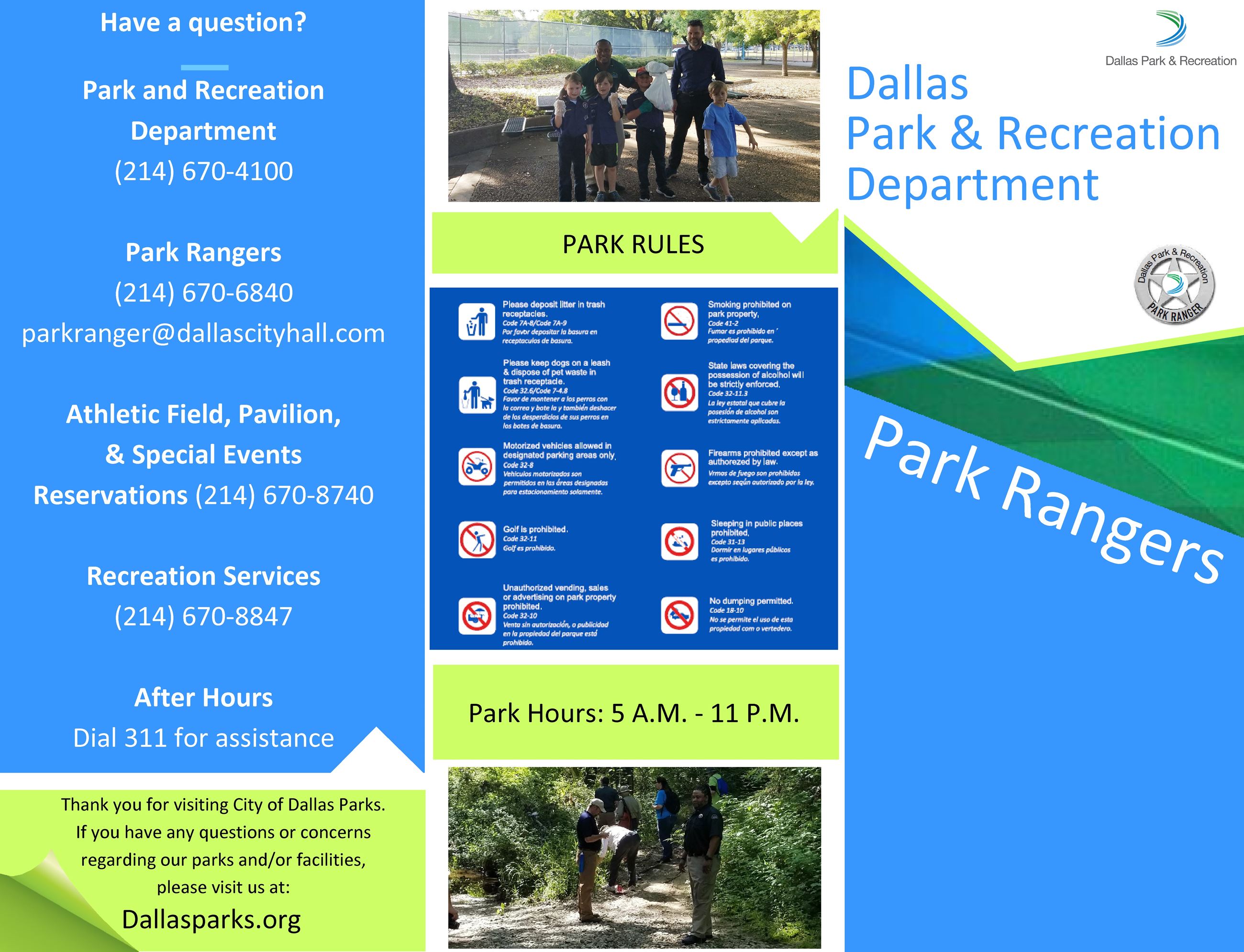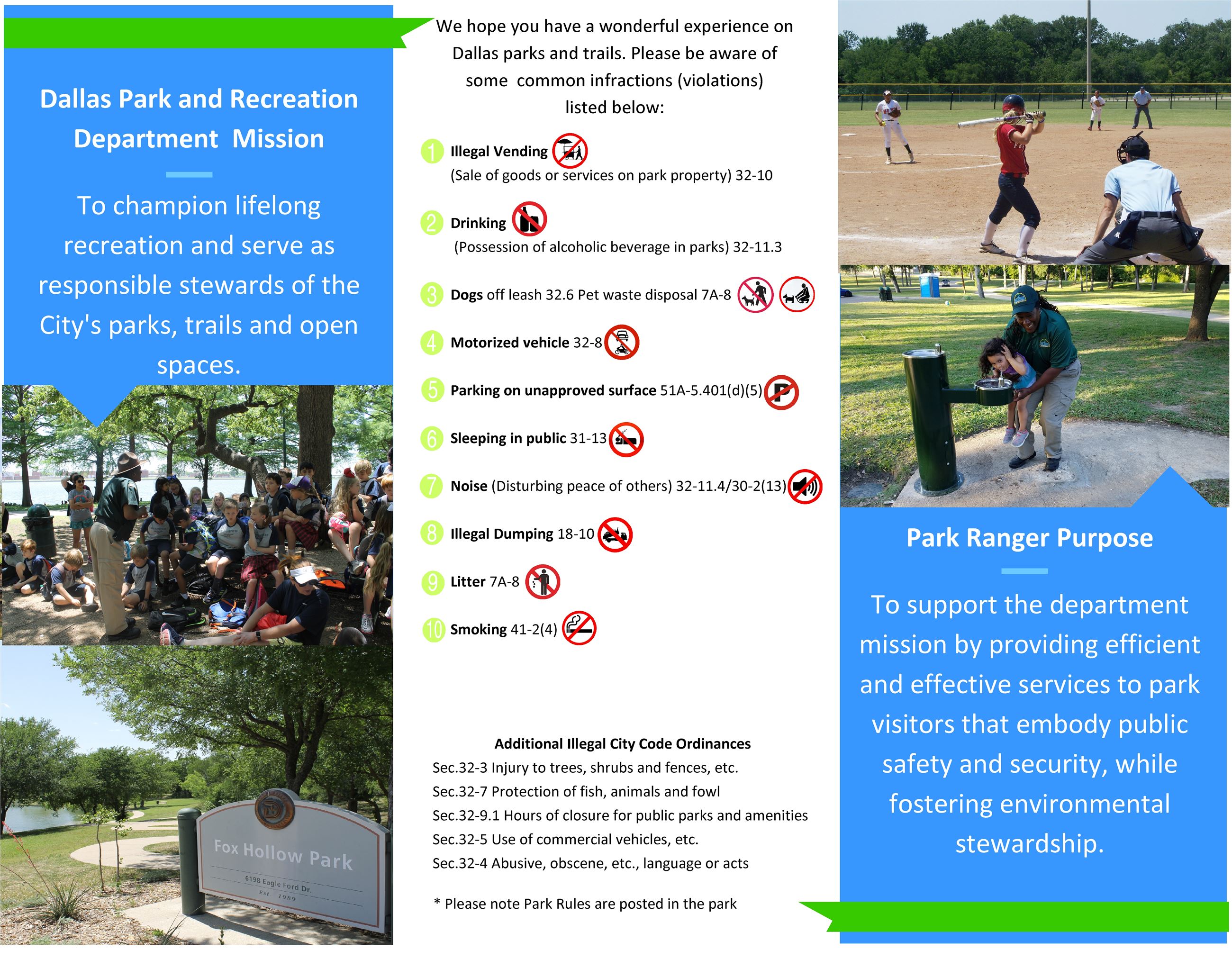 Our Park Rangers are actively involved in the park communities. You may see them meeting different school groups to help educate them on the Do's and Don'ts of Dallas Parks. You can also find our Park Rangers at various community events helping to teach citizens how to stay safe while enjoying a family day at the park!